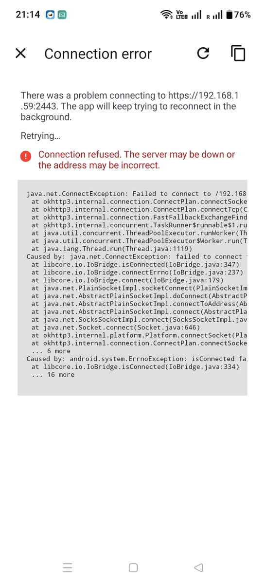 If you're having persistent connection issues, you can also check the app logs under Settings → Advanced → Record logs and share them for debugging.